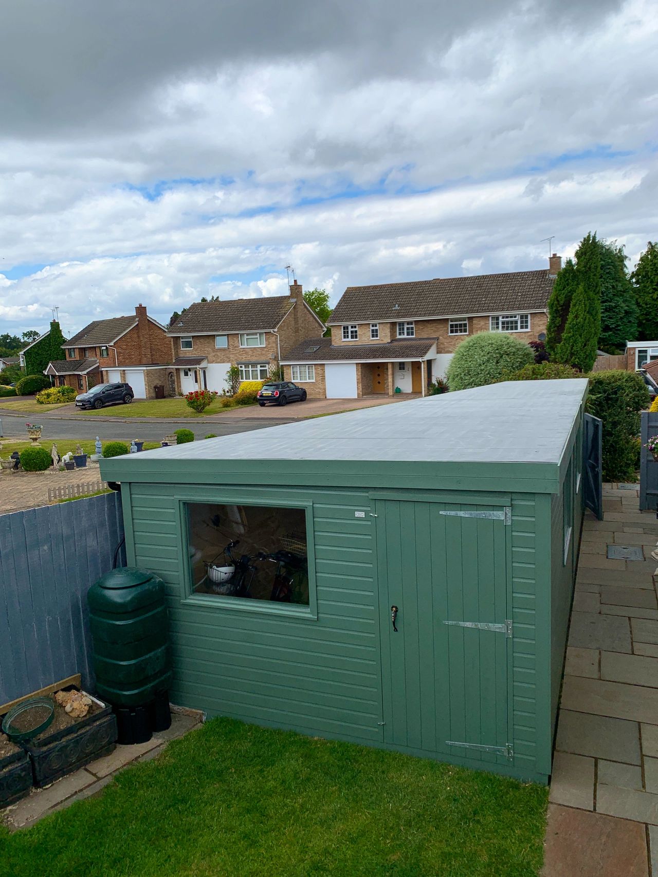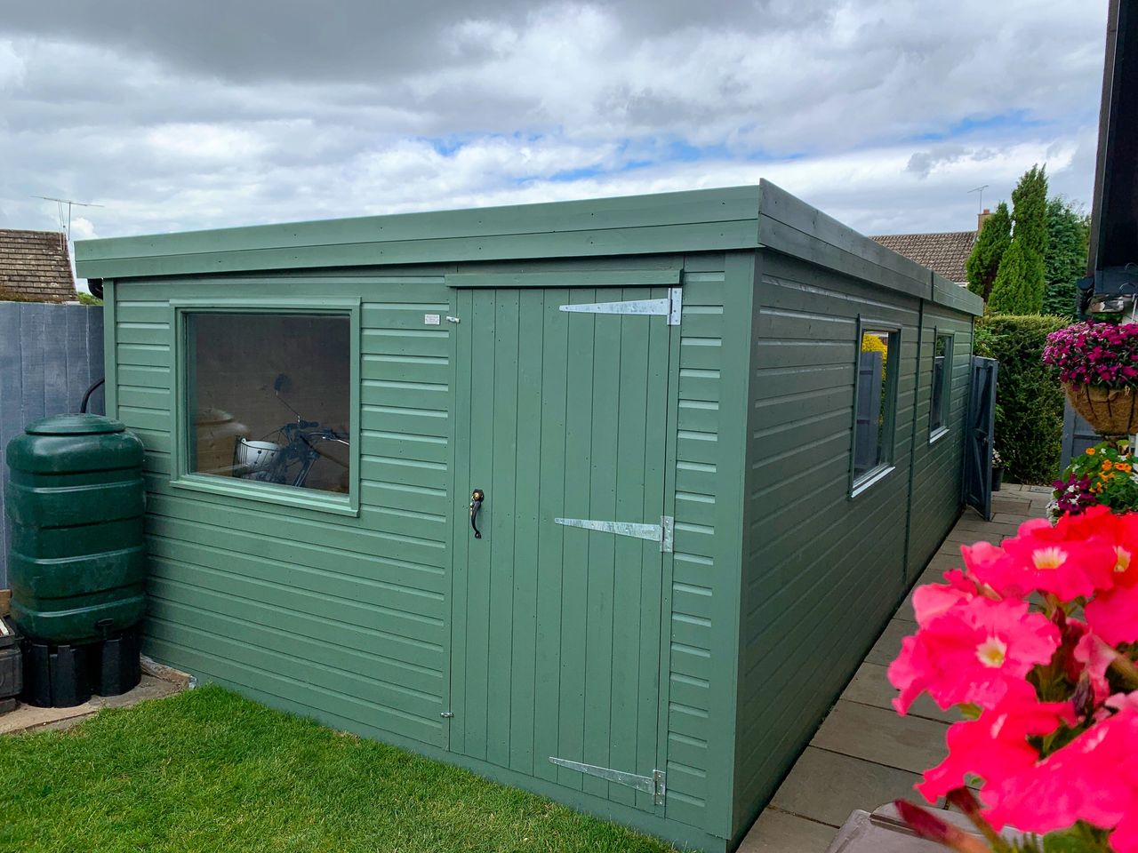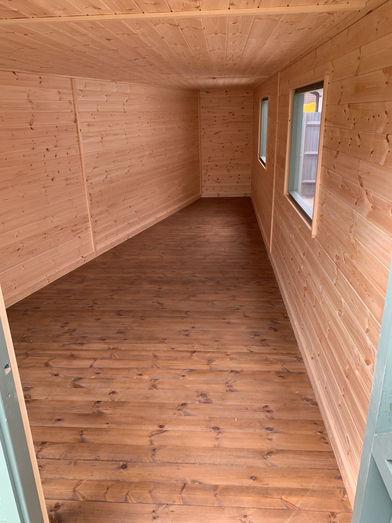 This week we have been putting the finishing touches to this huge wedge workshop.This building has been designed to make the most of an unused space in our clients garden.This building is 7.5m in length with a width that tapers from 3.4m down to 1.2m.This building has been fully insulated , double glazed windows ,Timber clad and topped off with EPDM rubber roofing.